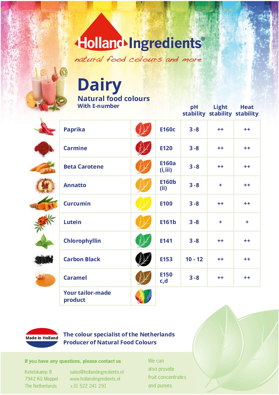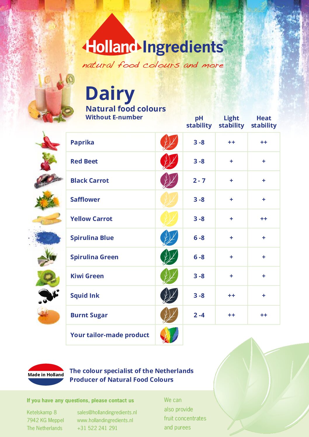 With regard to dairy, there are many different products that can be manufactured using natural colours. For example, cream cheese and hard cheese, yoghurt, milk or ice cream products. Each product you manufacture needs to be made using high quality ingredients that are stable and efficient to use.