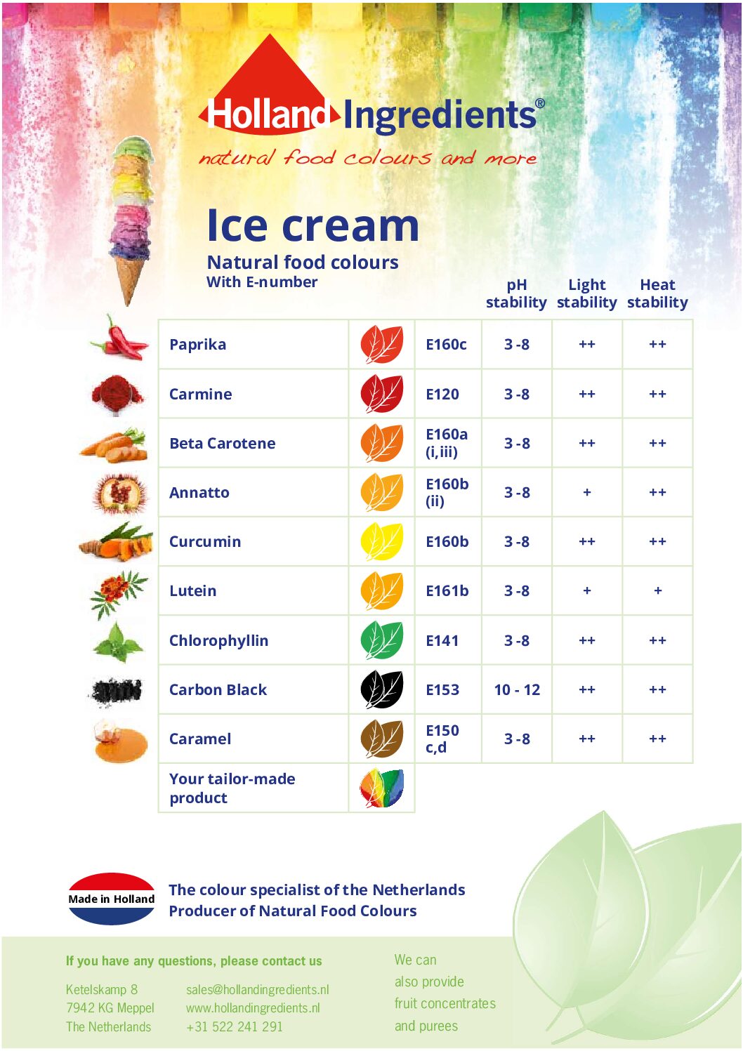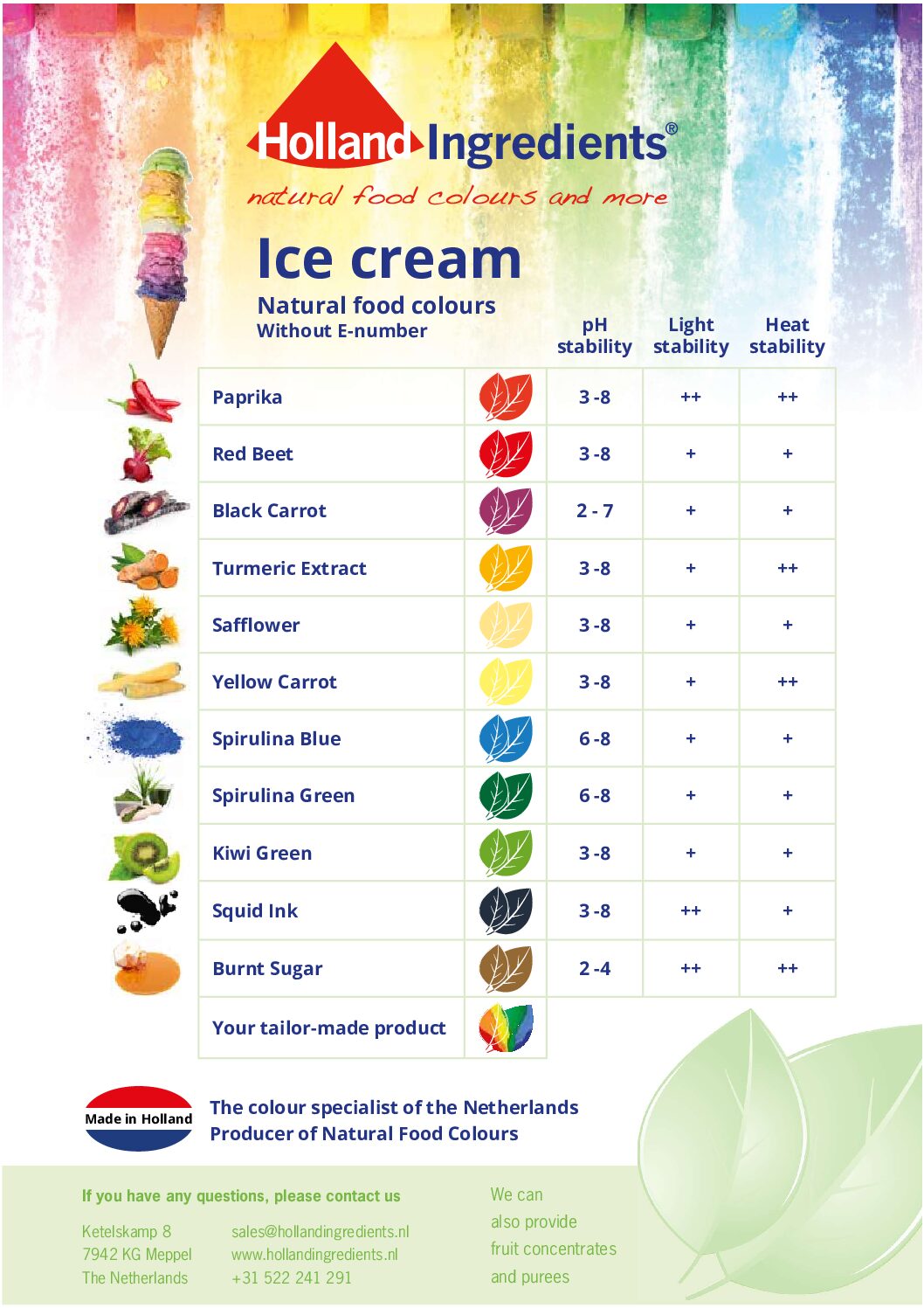 Holland Ingredients can help you with choosing the right colours. For example, our Spirulina Blue Solution produces a stunning blue colour and adding Carmine produces shades ranging from pink to red.